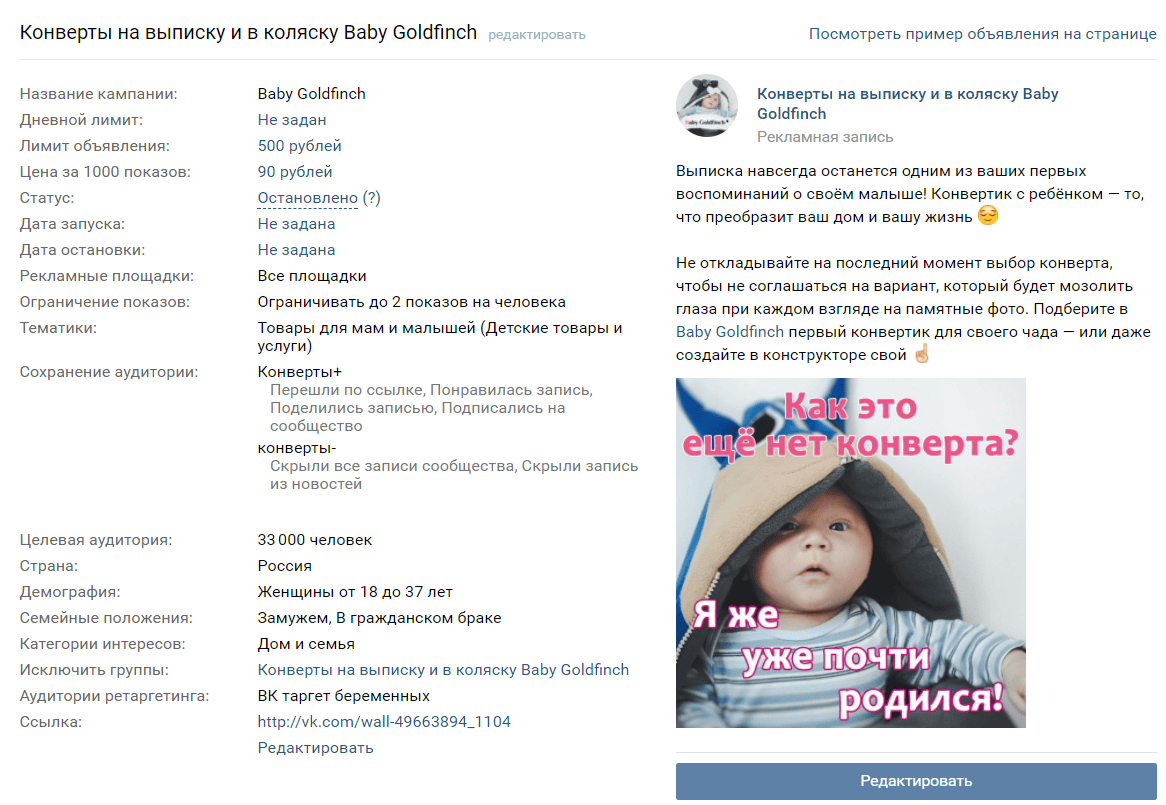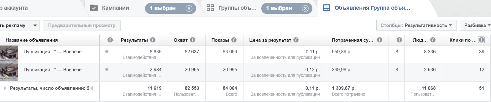 В Instagram протестировали два объявления и остановились на лучшем: при охвате 63099 человек получили 8635 взаимодействий всего, из них 39 переходов прямо на страницу интернет-магазина. Потрачено 960 рублей, по 11 копеек за каждое взаимодействие, по 25 рублей за каждый переход на страницу с рекламируемым товаром.